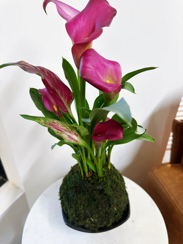 Elegant, sculptural, and bursting with spring color, the Calla Lily Kokedama is a striking fusion of floral beauty and traditional Japanese moss-ball artistry. Featuring graceful, trumpet-shaped calla lily blooms rising from a lush, hand-wrapped moss sphere, this living arrangement makes a bold yet refined statement in any space.