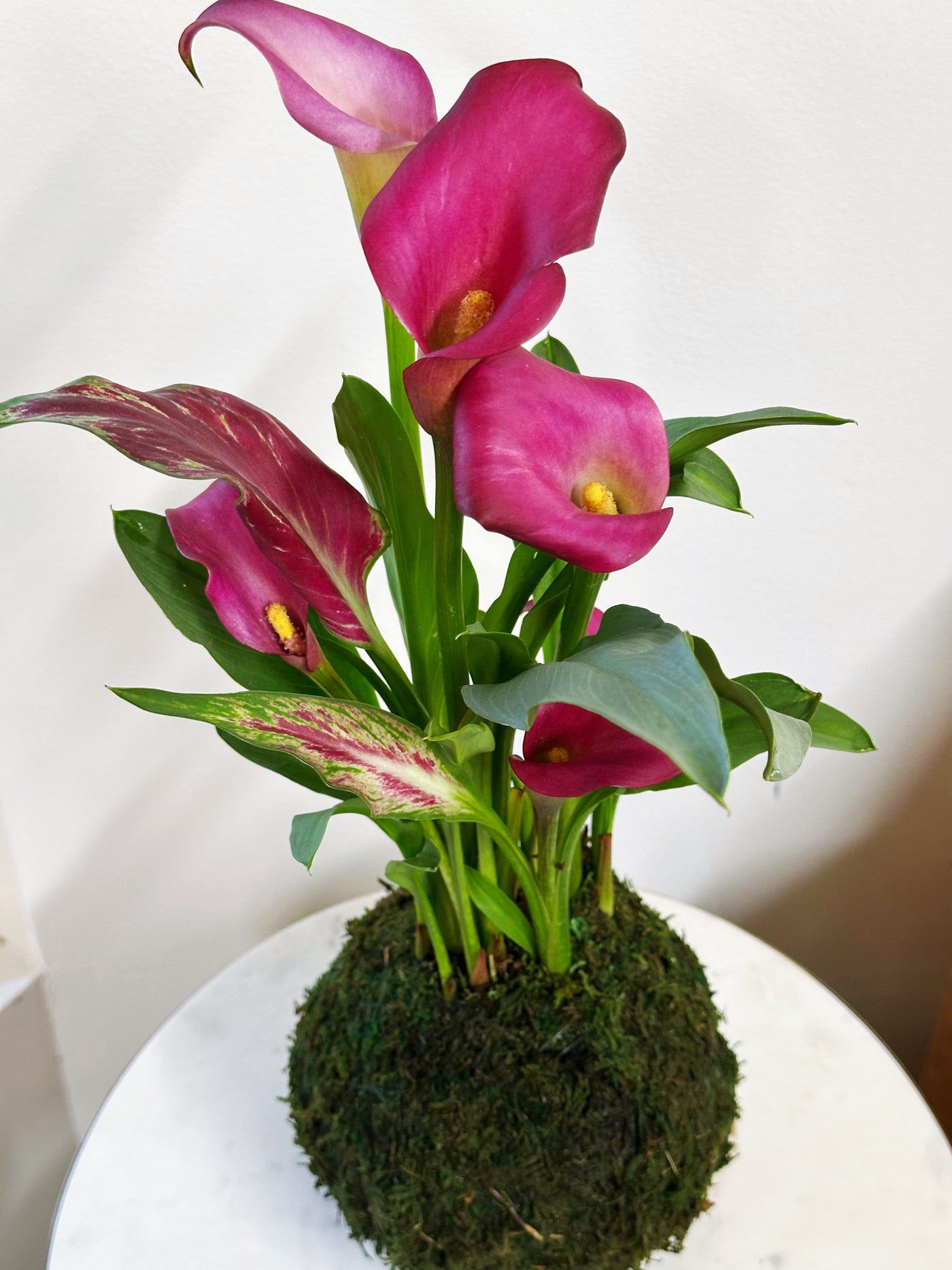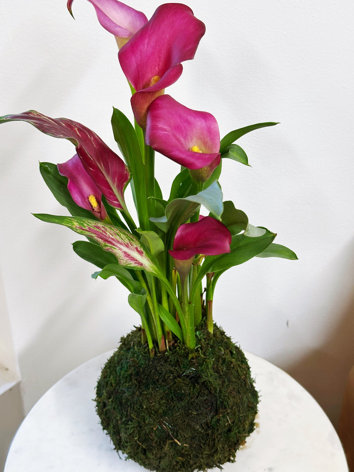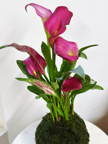 Calla lilies are prized for their smooth, architectural flowers and vibrant color. Each kokedama features blooms in shades of pink and purple, with natural variation in tone and pattern—making every piece completely one of a kind.