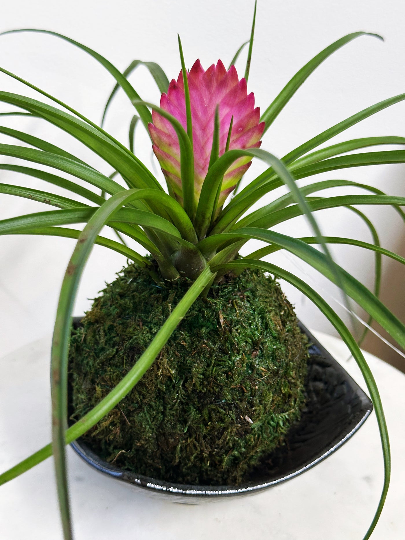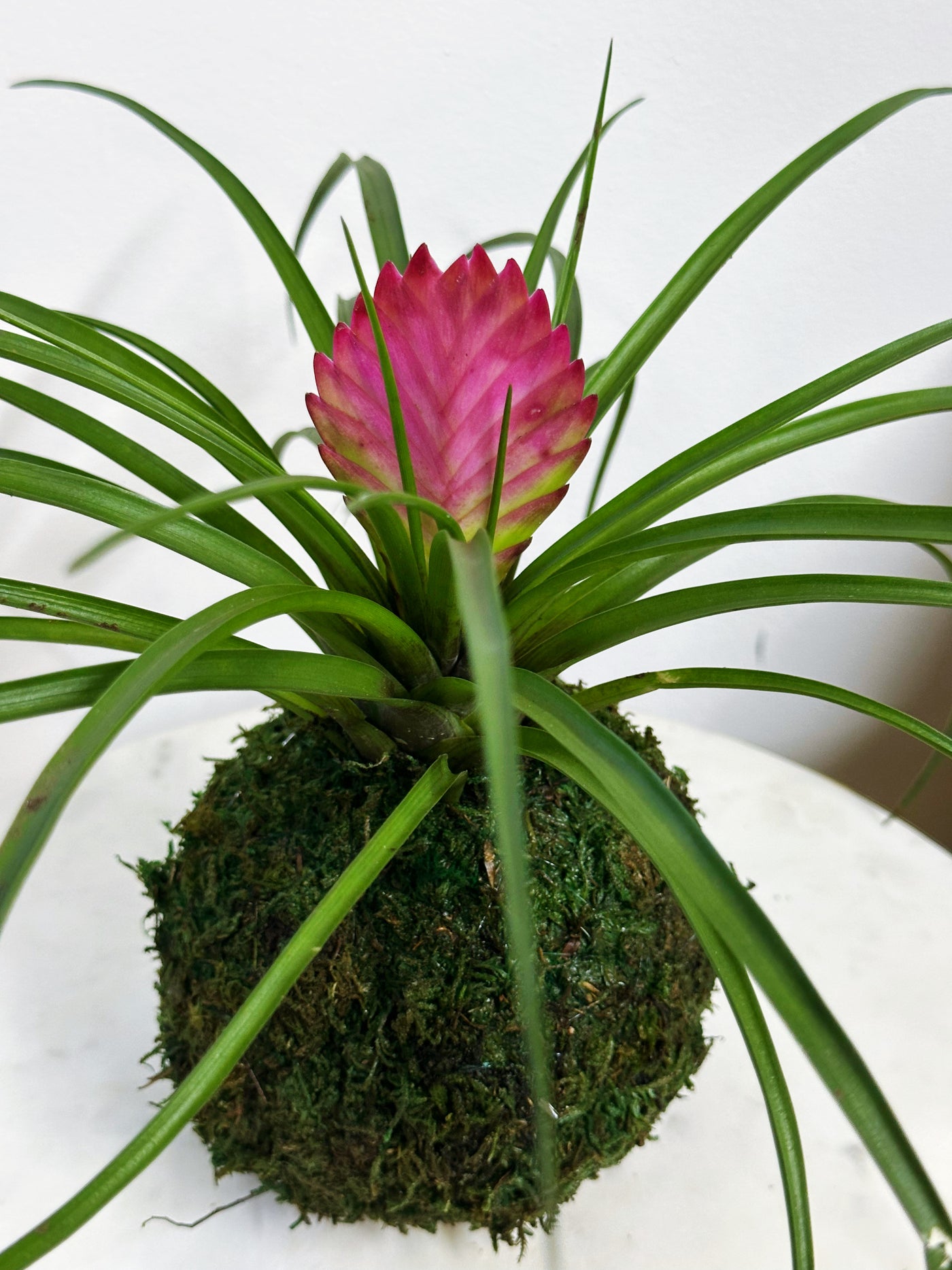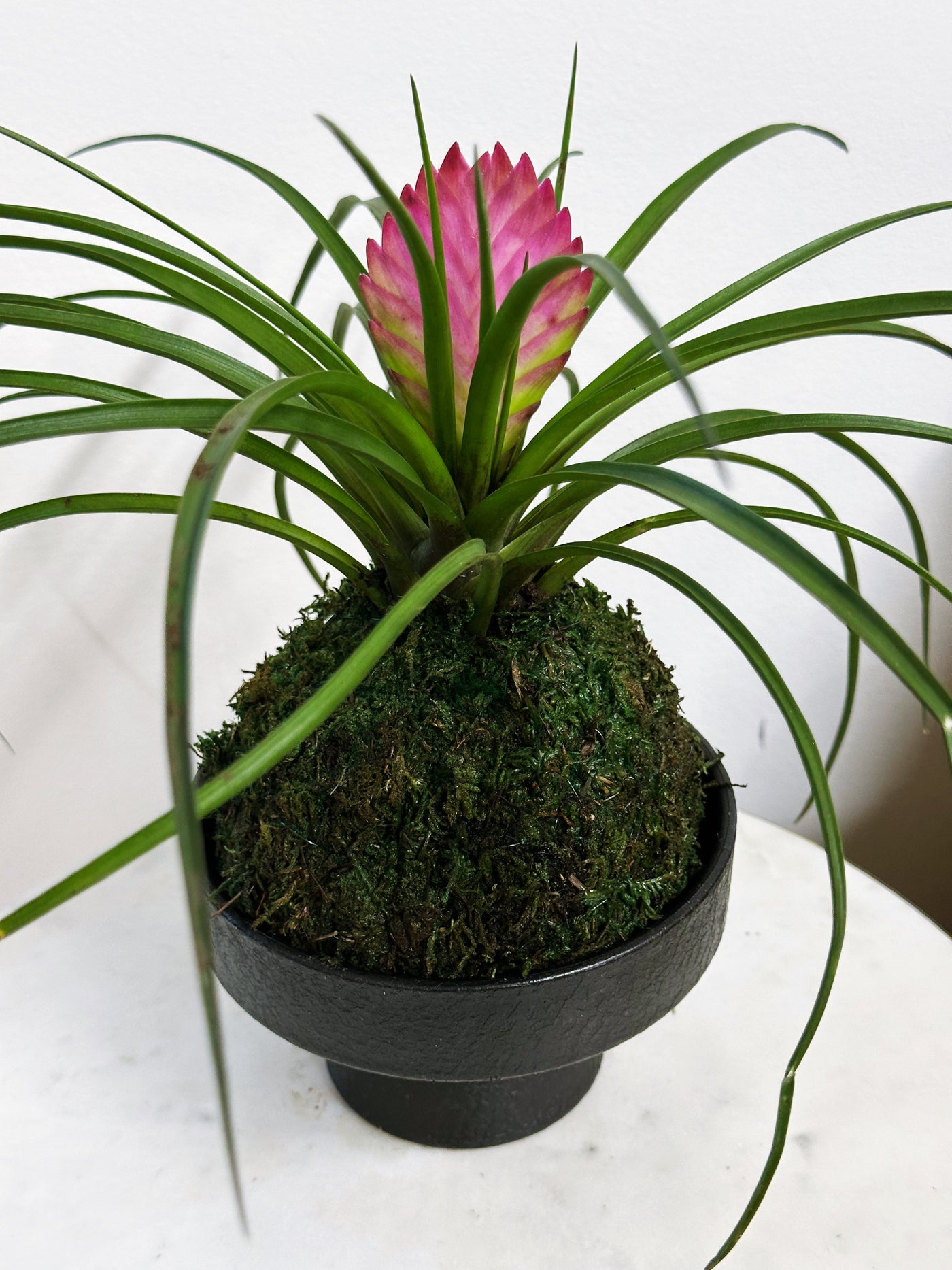 Each Pink Quill Bromeliad Kokedama is handmade and one of a kind. Bloom size, flower progression, and moss shape will vary naturally.